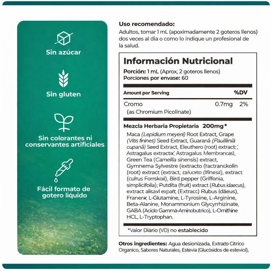 Tome 1 ml (aproximadamente 2 goteros) dos veces al día. Puede colocarlo debajo de la lengua para una absorción más rápida o mezclarlo con agua si lo prefiere.