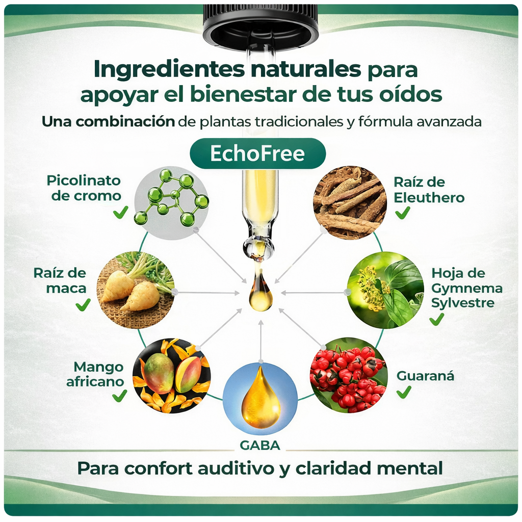 EchoFree actúa favoreciendo una circulación saludable, calmando las señales nerviosas excesivas y promoviendo el equilibrio en el oído interno, factores clave relacionados con la comodidad y la claridad auditivas.