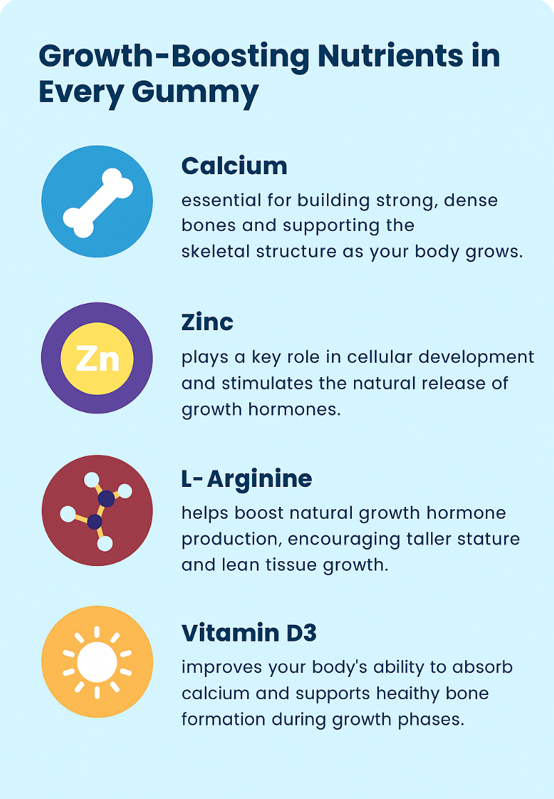 Formulated with growth-promoting nutrients like L-Arginine, Calcium, and Zinc to help unlock your body's full height potential.