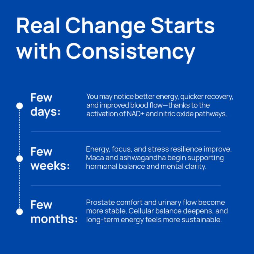 Most users start feeling more energized and focused within 2–4 weeks. After 6–8 weeks, many report noticeable improvements in stamina, circulation, and prostate comfort.