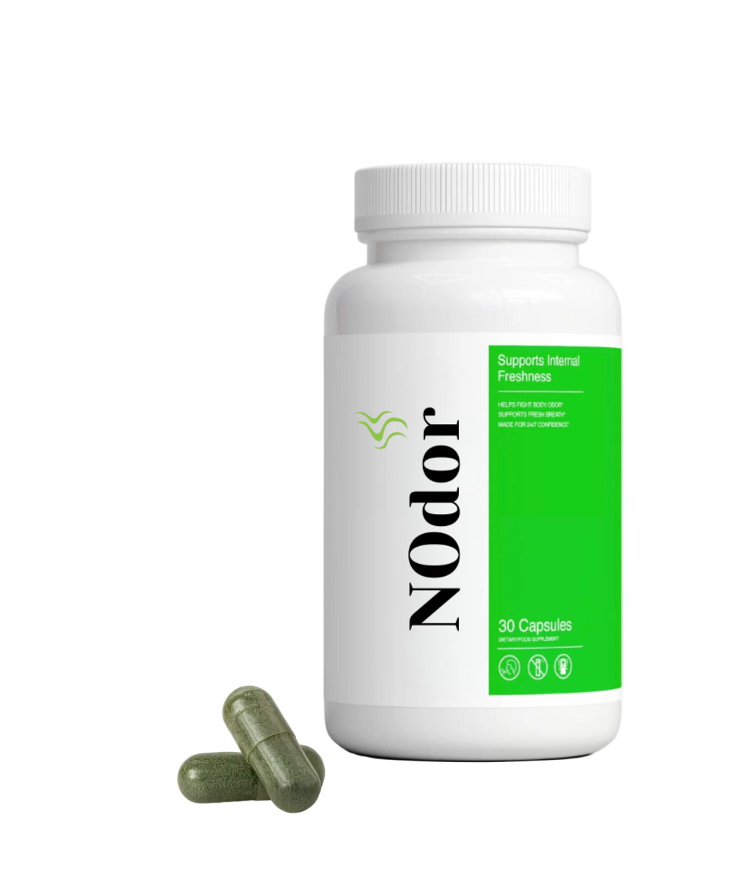 Nodor is an all-natural internal deodorant capsule designed to neutralize odor-causing compounds from within. Its plant-based formula works through the digestive system to promote long-lasting freshness — for your breath, body, and overall confidence.