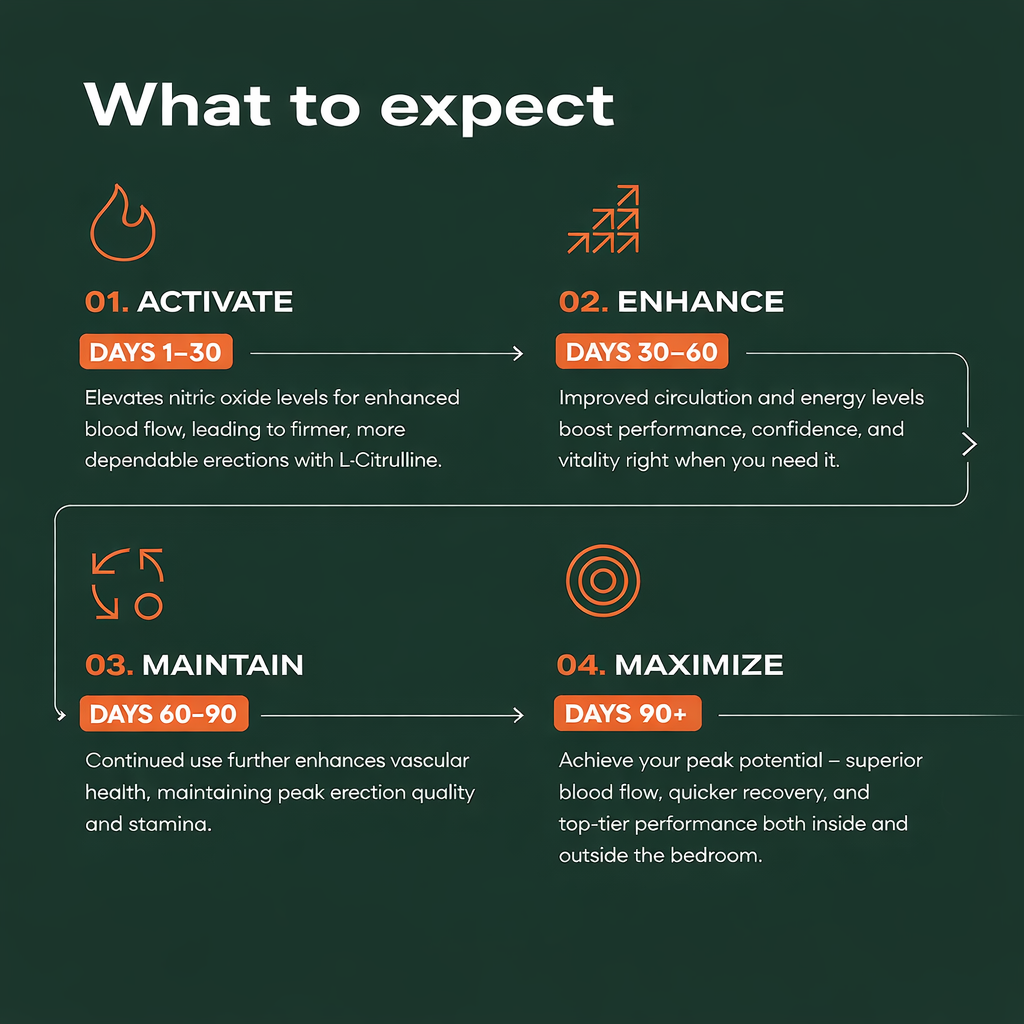 After taking our Sexual Performance Booster, levels of arginine, citrulline, and nitrates in the body begin to rise. These compounds help stimulate nitric oxide production, which improves circulation and supports stronger blood flow where it matters most.