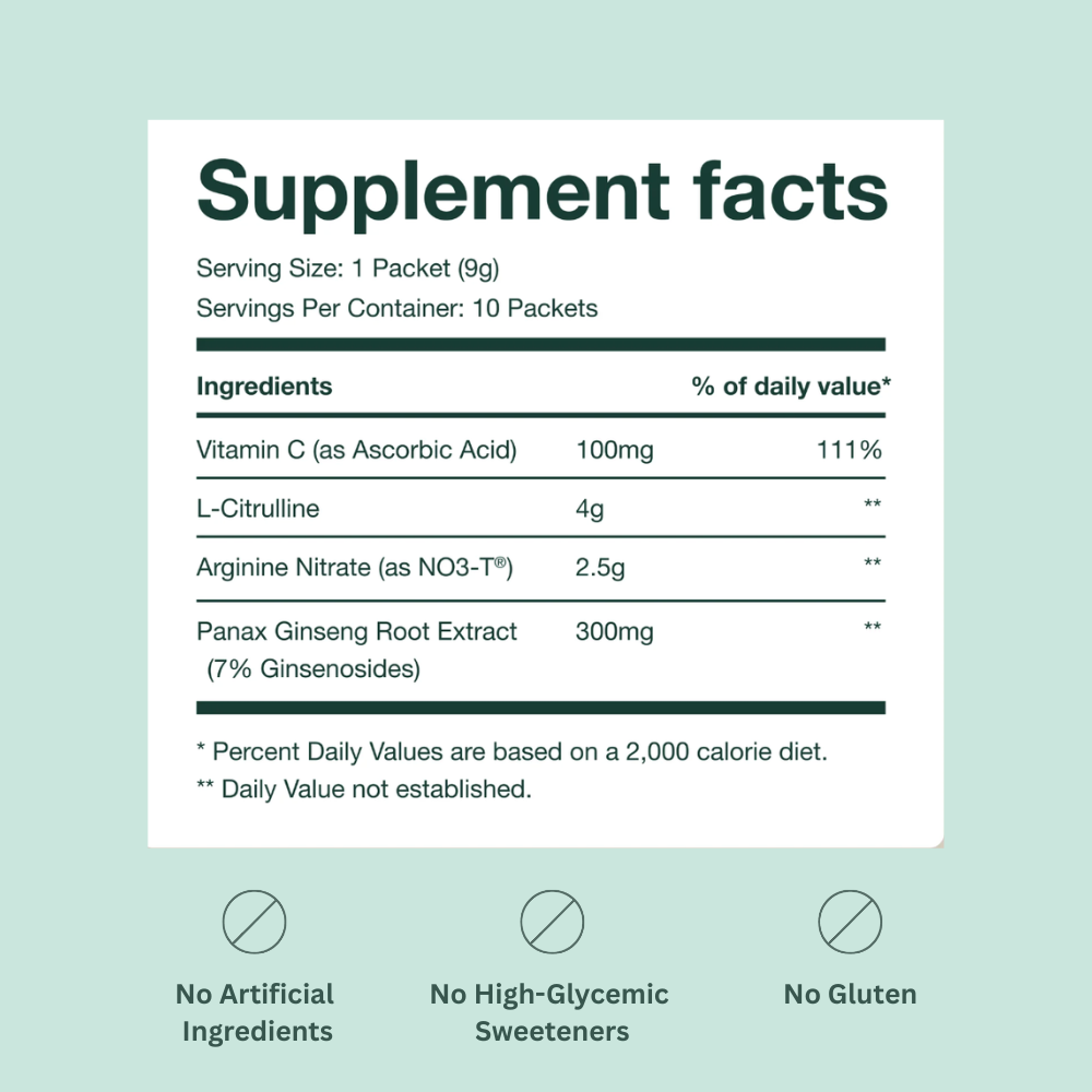 At the same time, Vitamin C helps protect nitric oxide from breaking down due to oxidative stress, allowing it to work more effectively. Panax ginseng further supports nitric oxide activity while helping reduce fatigue and promote energy and arousal.